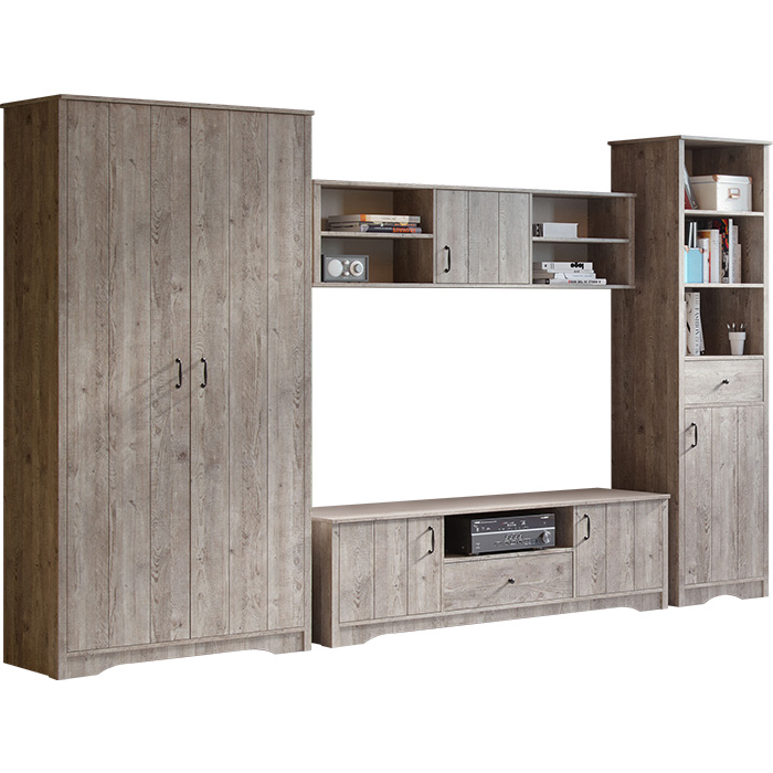 Гарнитур в собранном виде будет смотреться очень гармонично, так как все элементы выполнены в едином стиле. Практичность, удобство и функциональность — основные критерии модульных систем. Завершите образ комнаты яркой деталью!