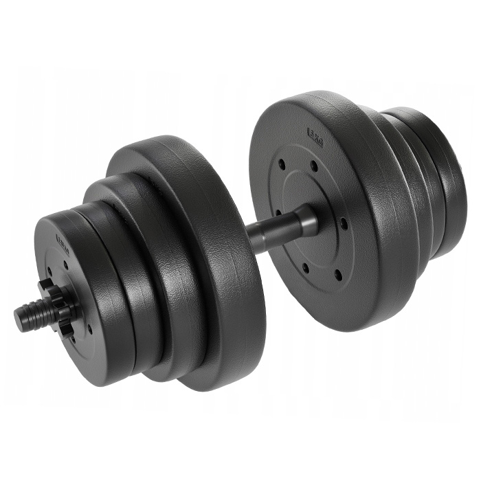 Модель состоит из 3 стальных дисков: 2 по 10 кг и 1 —12 кг. Их можно комбинировать по предпочтениям. А также докупать другие составляющие необходимого вам веса. Фиксируются диски высокопрочными пластиковыми гайками. Они защитят от выпадения элементов и гарантируют безопасность использования.